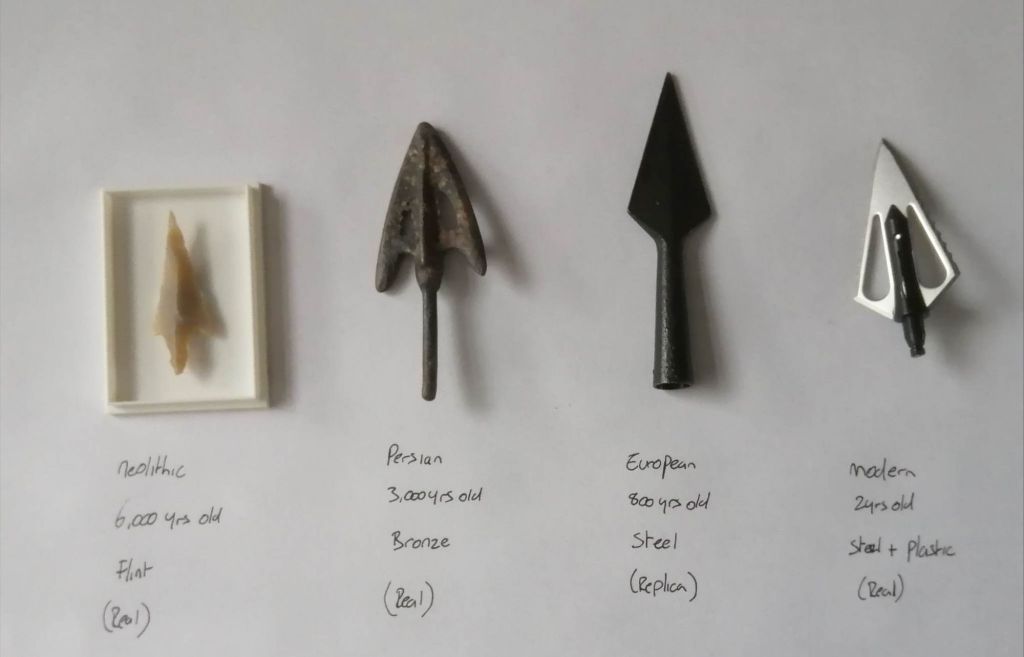 The collection also includes some real, but mostly replica, historical weapons*, which are a combination of handheld and projectiles, that chart the evolution of warfare throughout history. From the Spear and Atlatal, to the Bow & Arrow and finally at the invention of guns. I have a sample from different time periods which I can show. (see historical weapons menu for more detailed information).